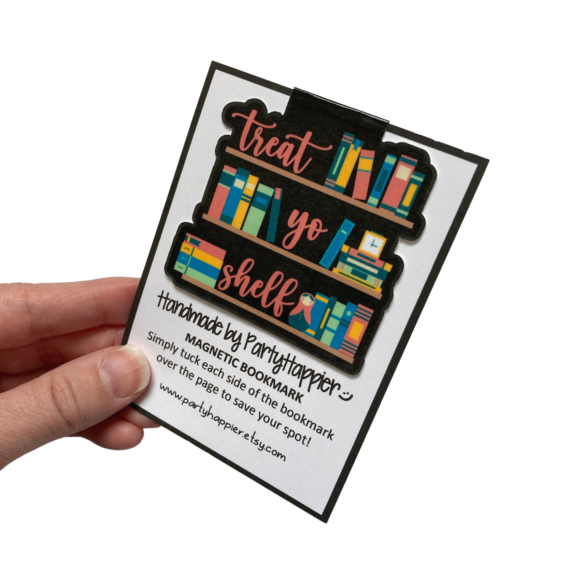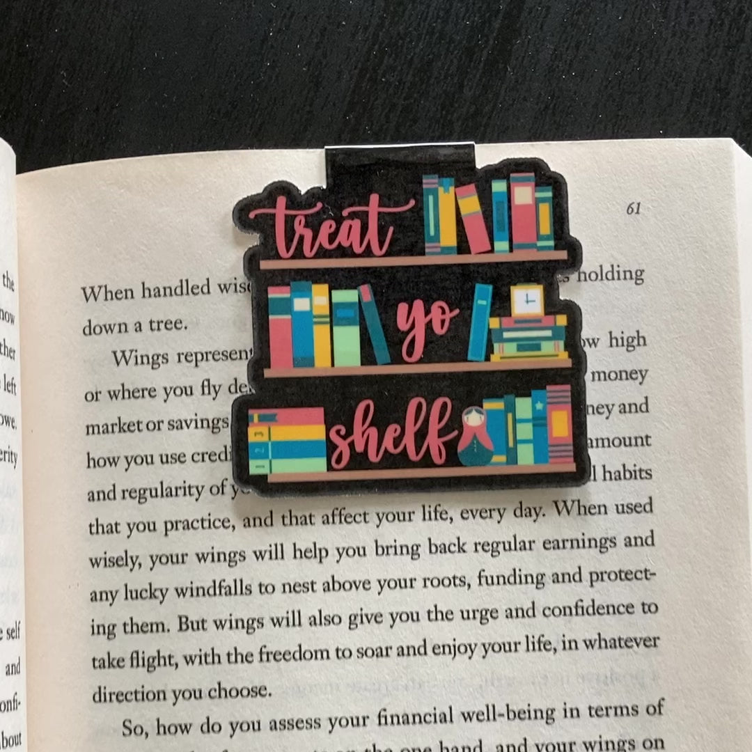 This listing is for one magnetic bookmark that says, "Treat Yo Shelf." It's perfect for holding your place just about anywhere! Use it in your favorite book, planner, notebook, or wherever your heart desires!