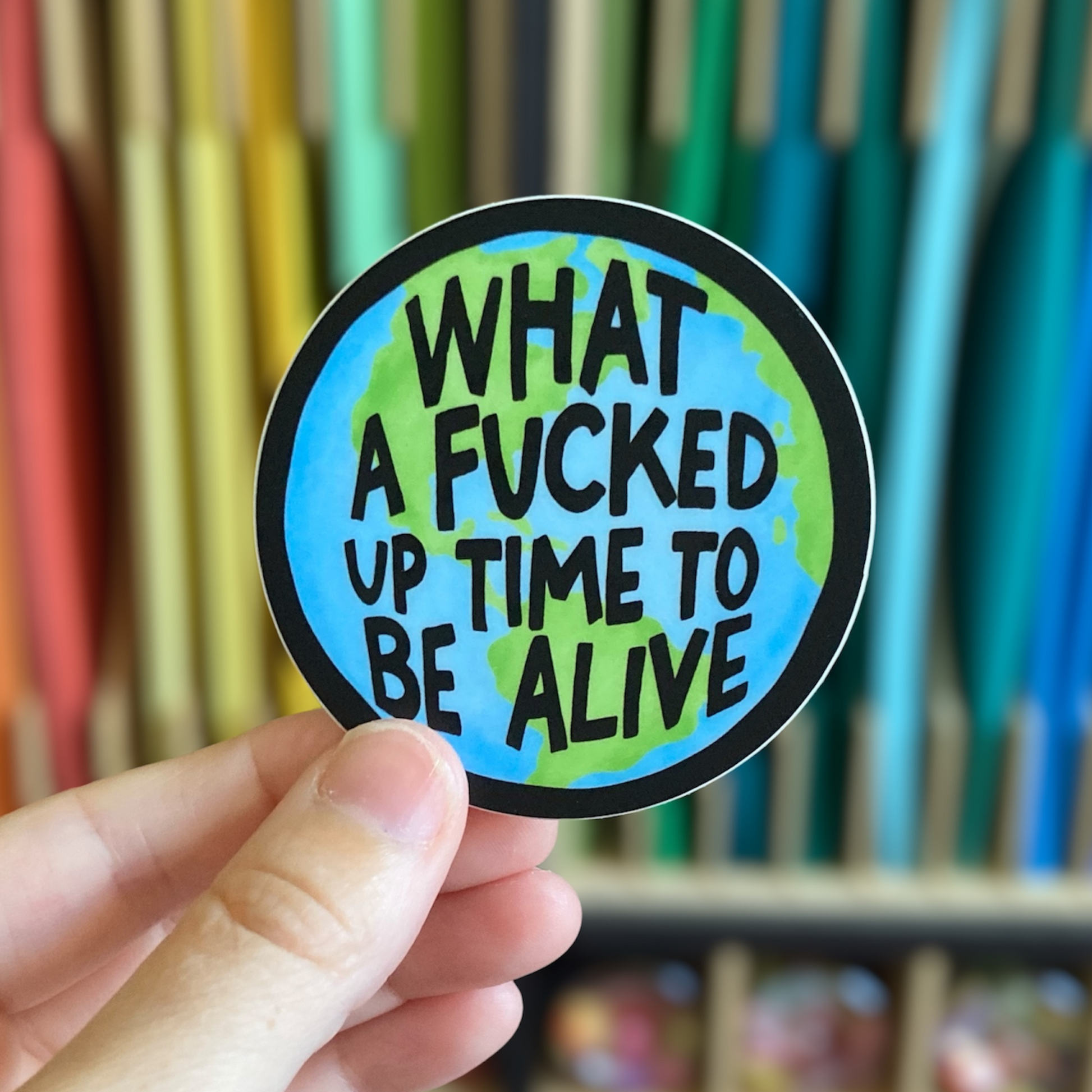 This listing is for one "What A Fucked Up Time To Be Alive" sticker. It is the perfect addition to your water bottle, computer, notebook, or any surface your heart desires!