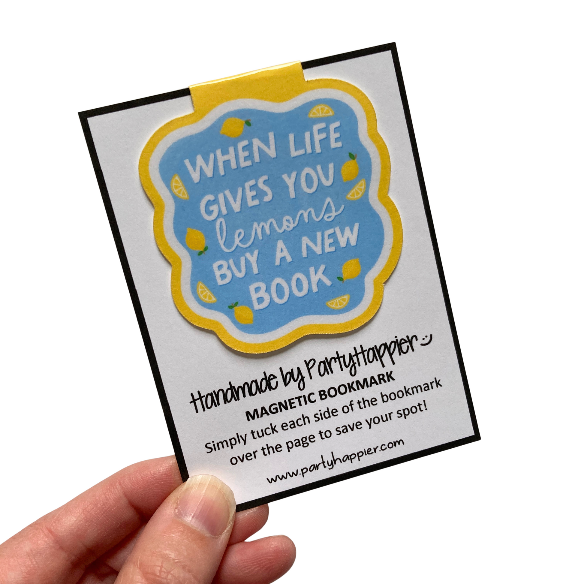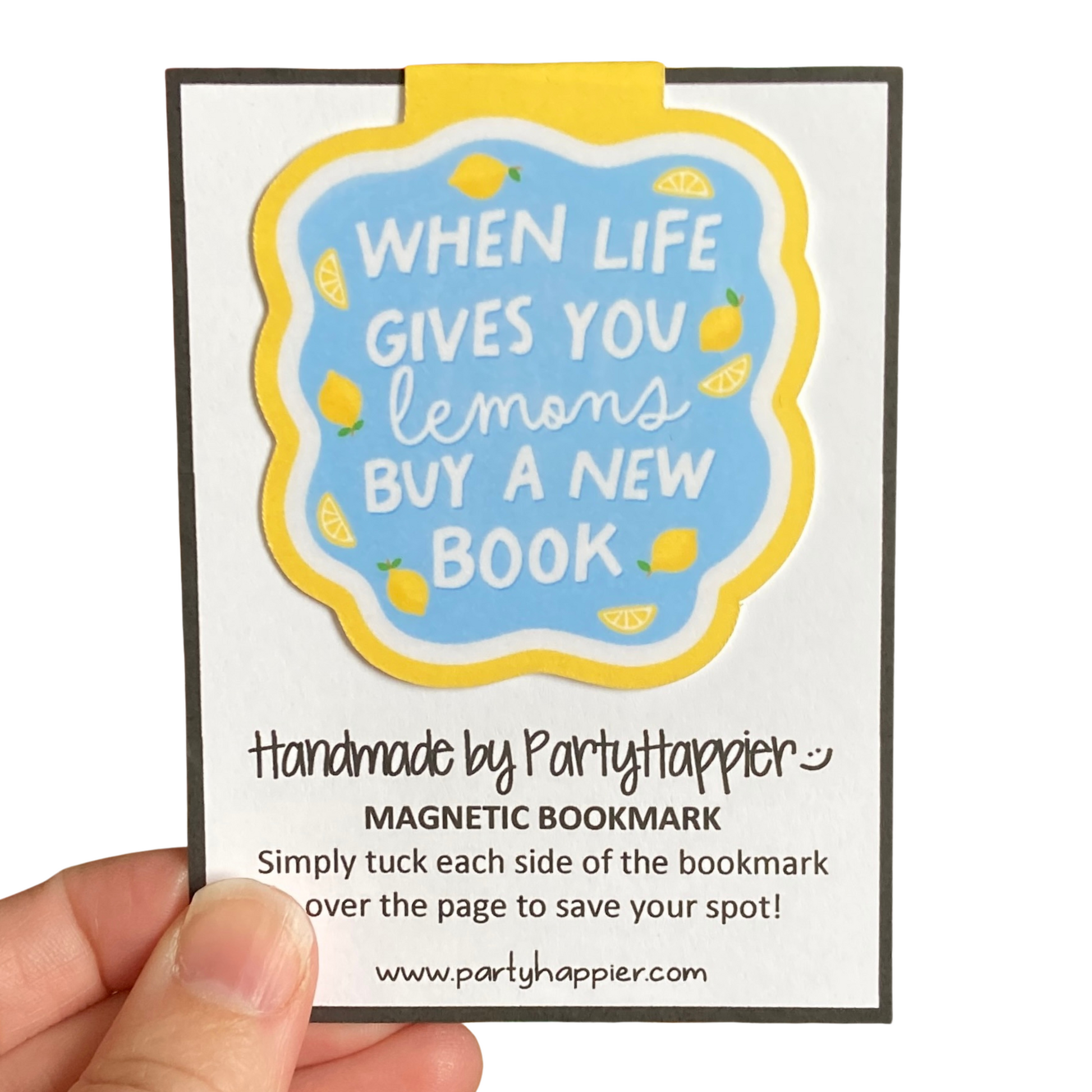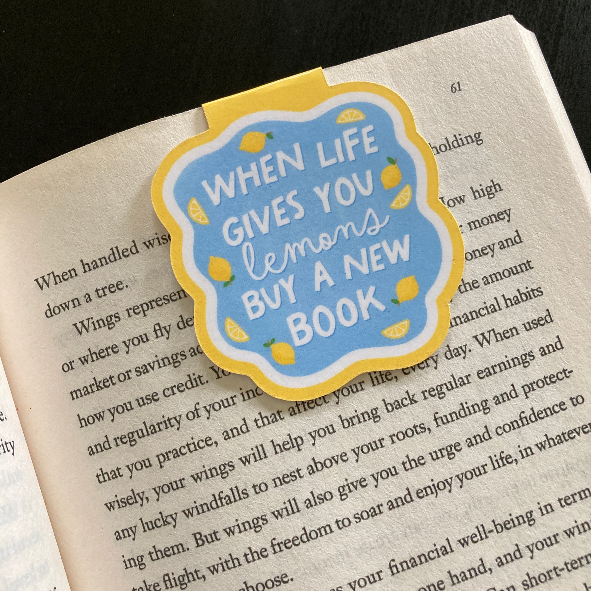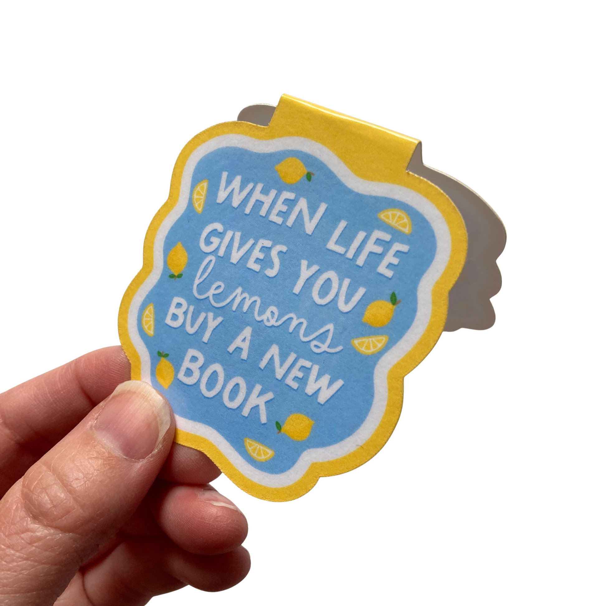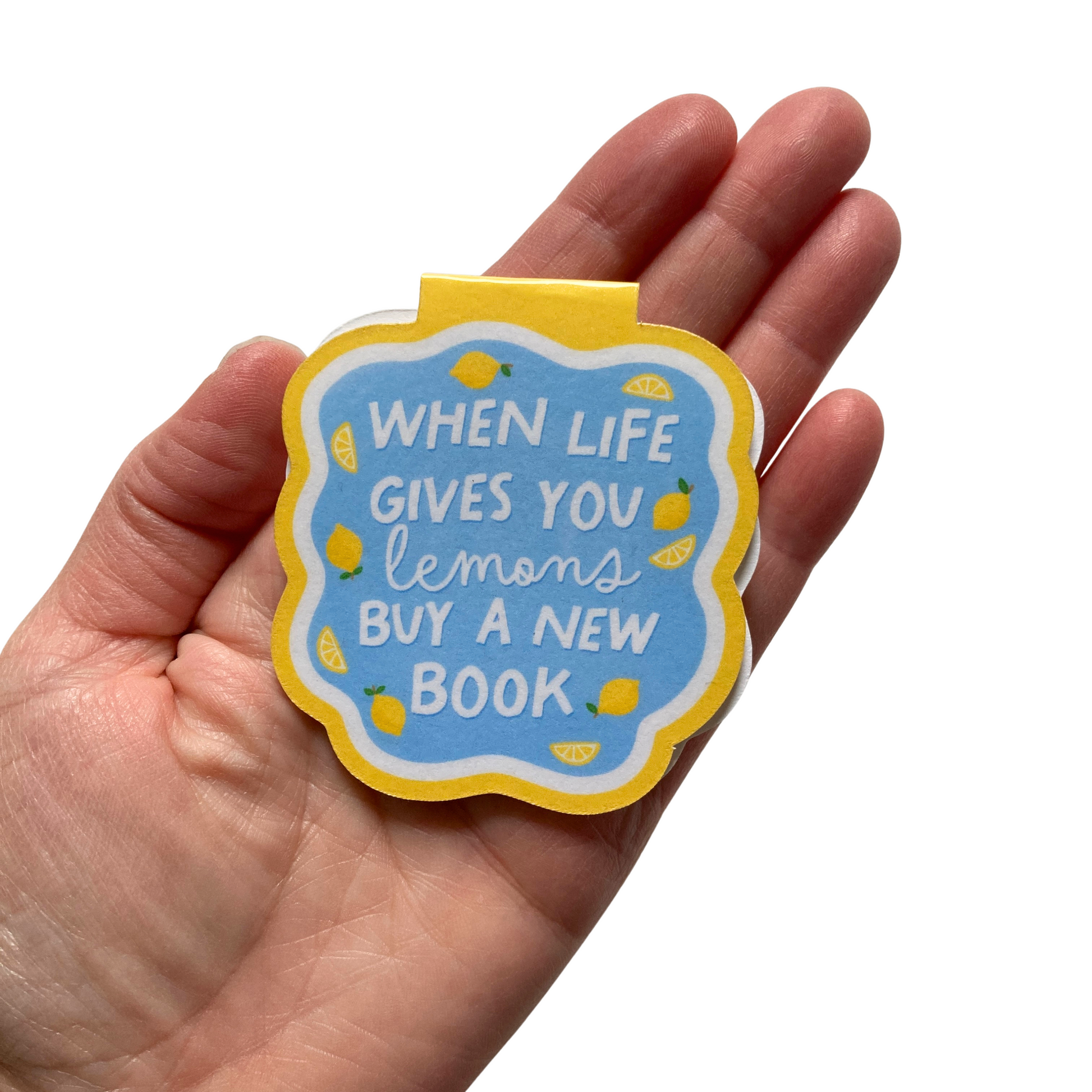 This listing is for one magnetic bookmark that says, "When Life Gives You Lemons Buy A New Book." It's perfect for holding your place just about anywhere! Use it in your favorite book, planner, notebook, or wherever your heart desires!