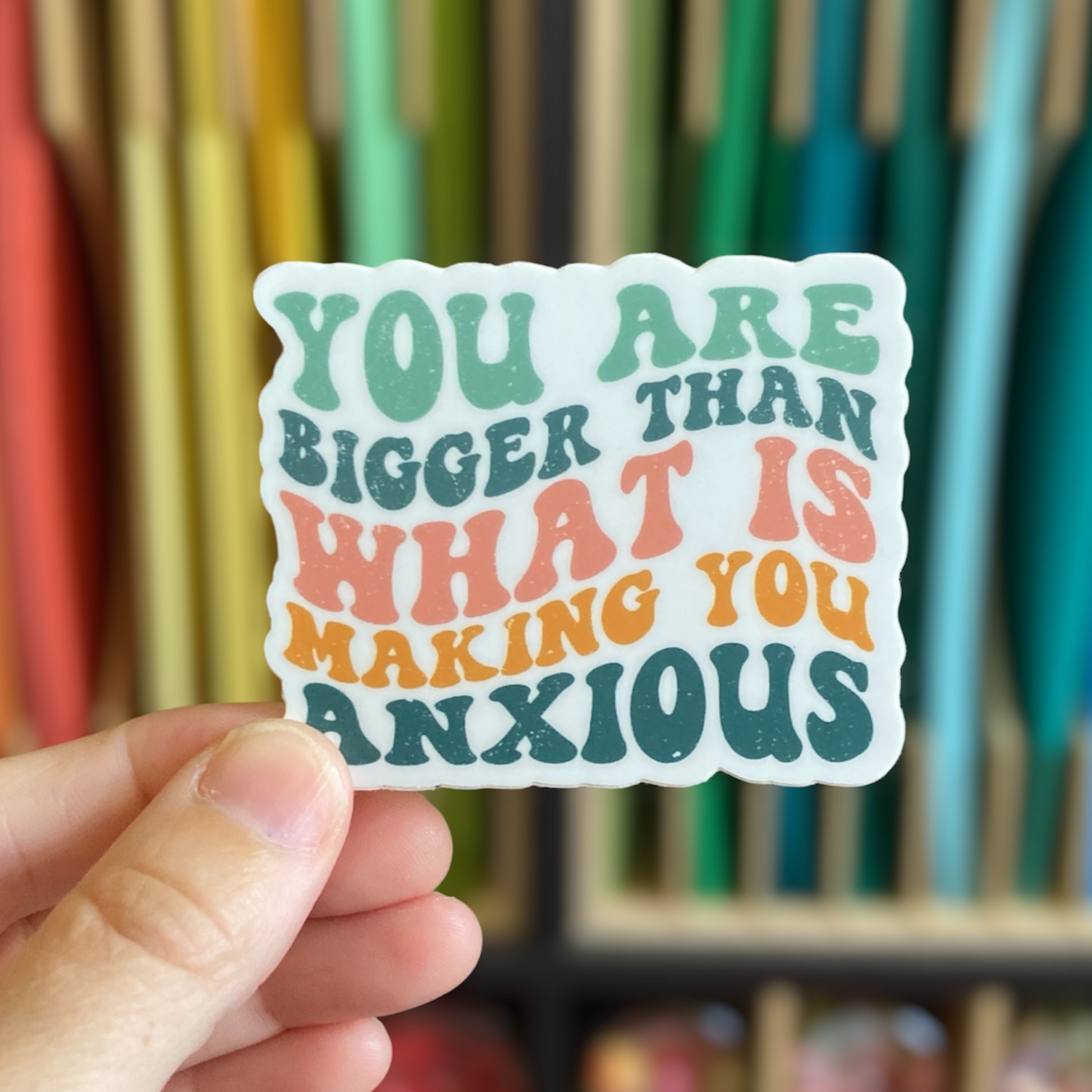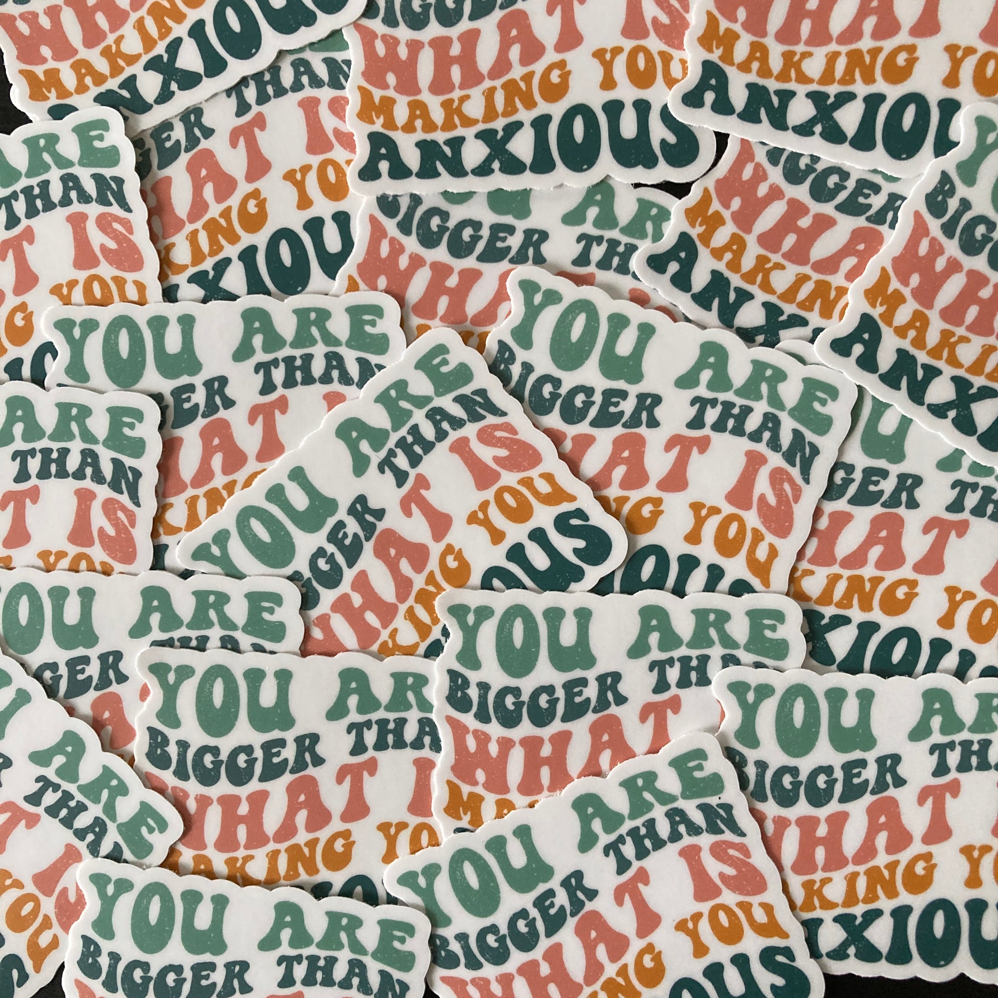 This listing is for one "You Are Bigger Than What Is Making You Anxious" vinyl sticker. It is the perfect addition to your water bottle, computer, notebook, or any surface you desire!