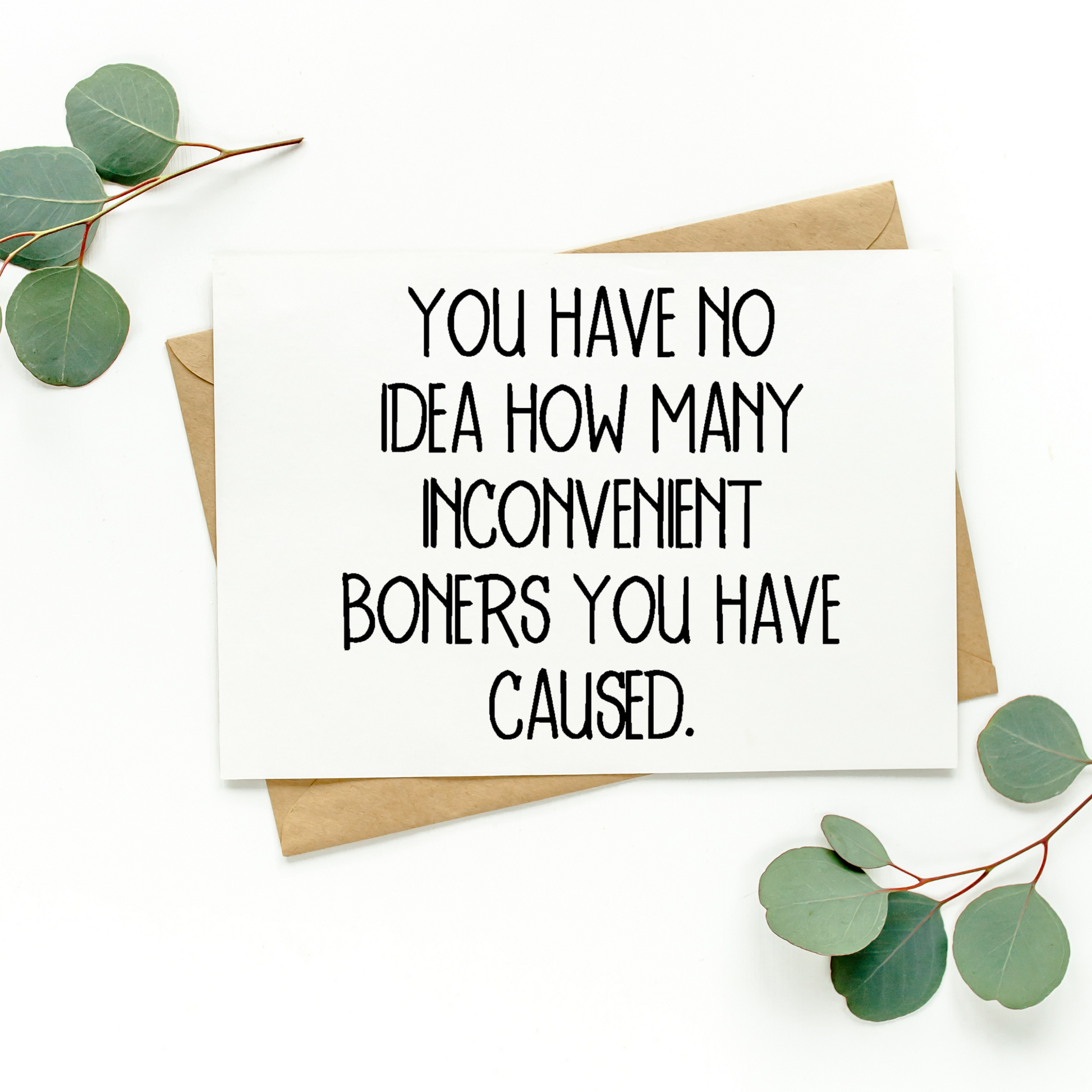 This listing is for one blank greeting card that says, "You Have No Idea How Many Inconvenient Boners You Have Caused." Nothing like getting straight to the point with this one;)