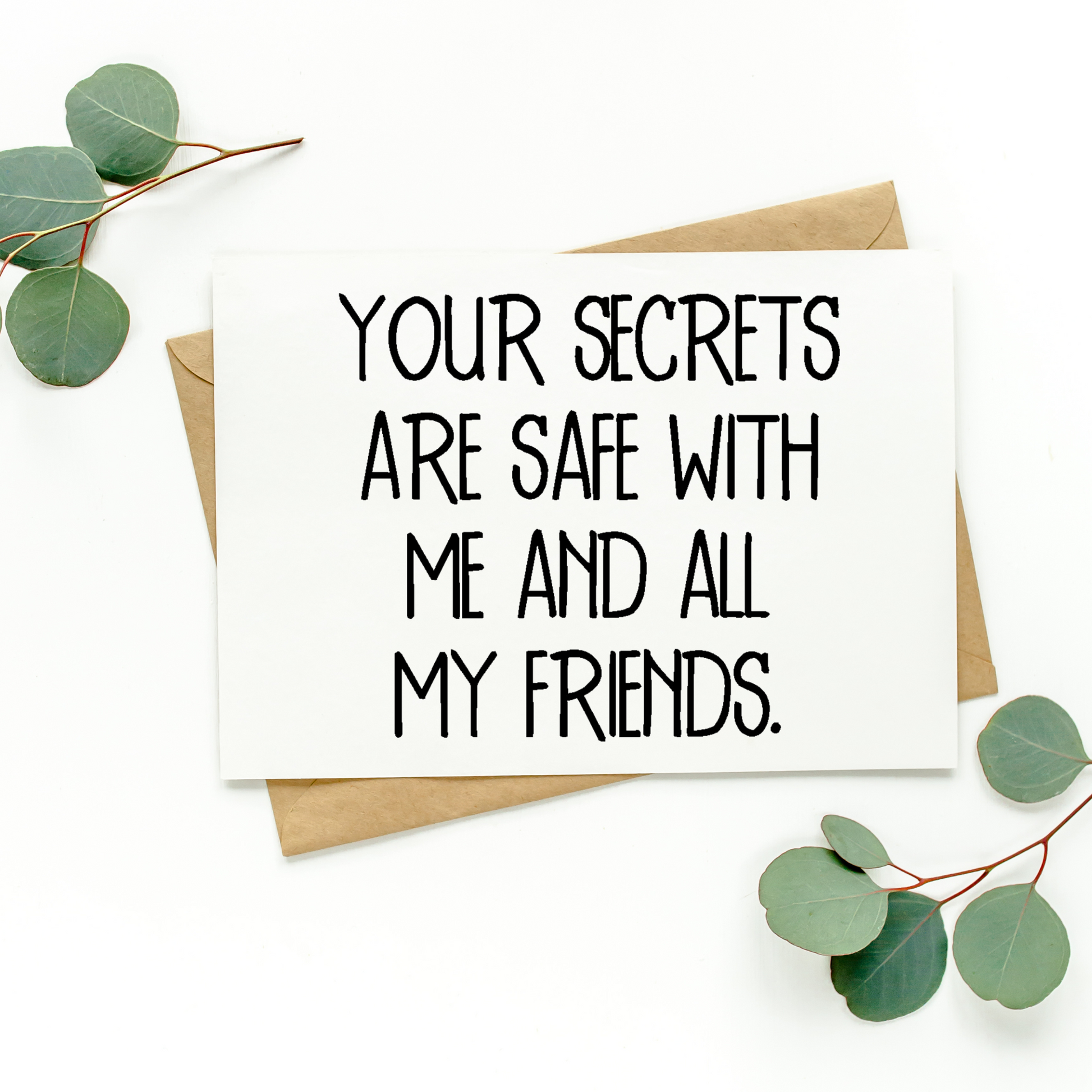 This listing is for one blank greeting card that says, "Your Secrets Are Safe With Me And All My Friends." Enough said;)