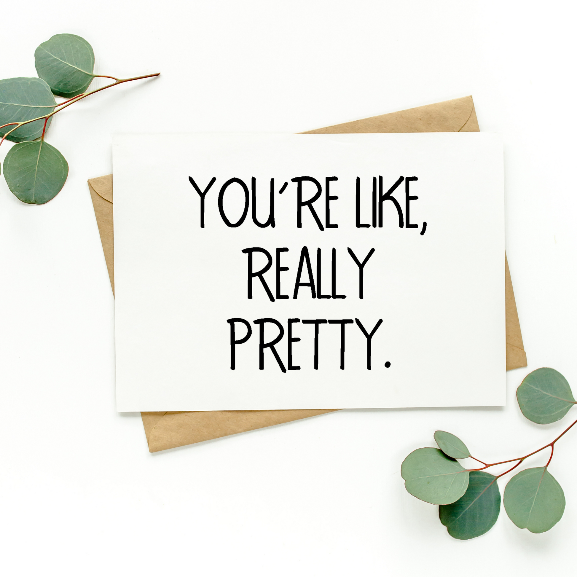 This listing is for one blank greeting card that says, "You're Like, Really Pretty." Something tells us your favorite ladies will get a kick out of this card, especially if they're a Mean Girls fan!