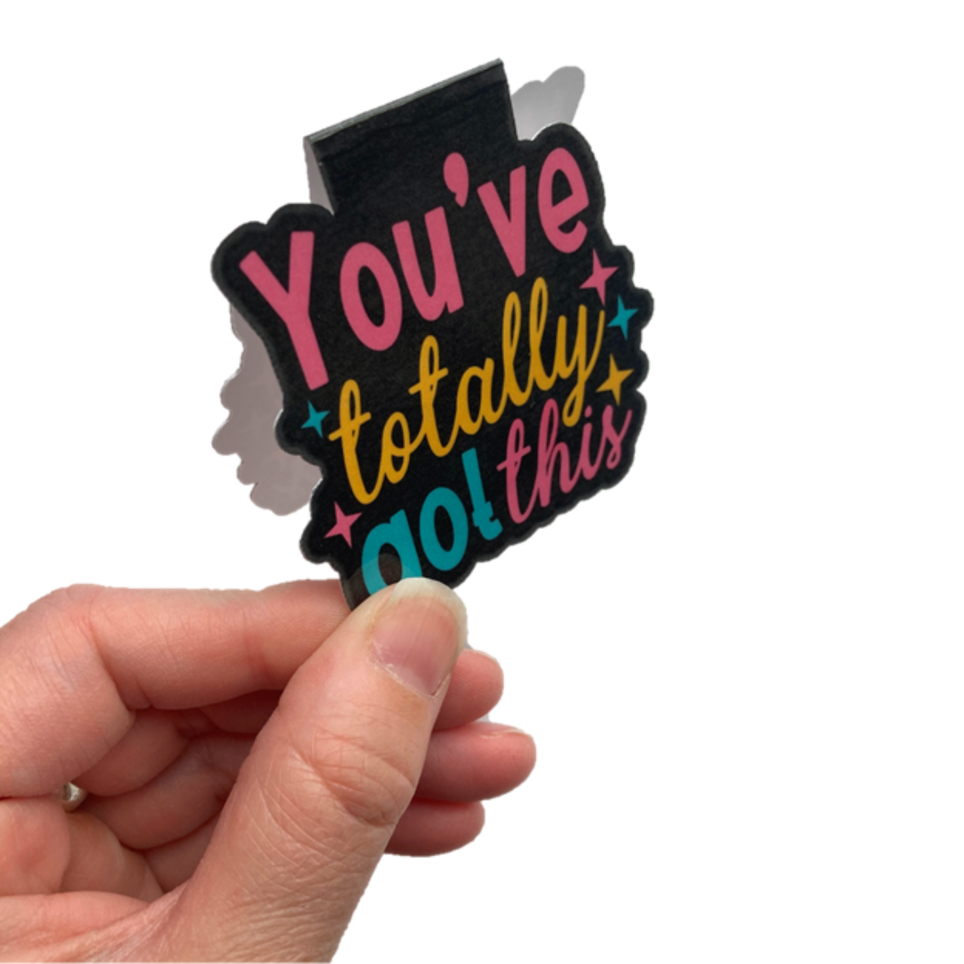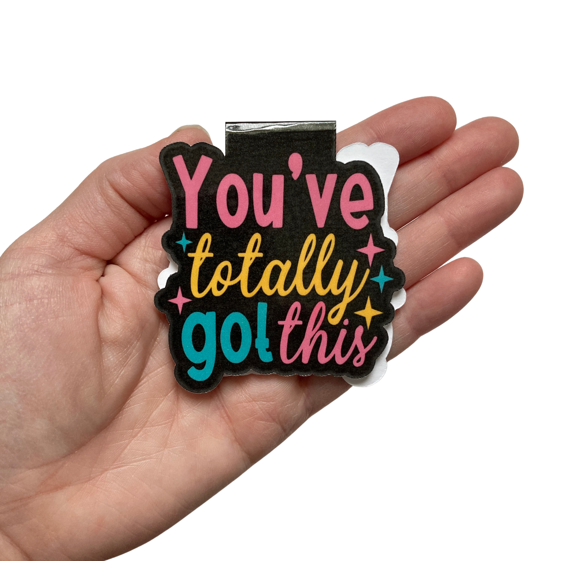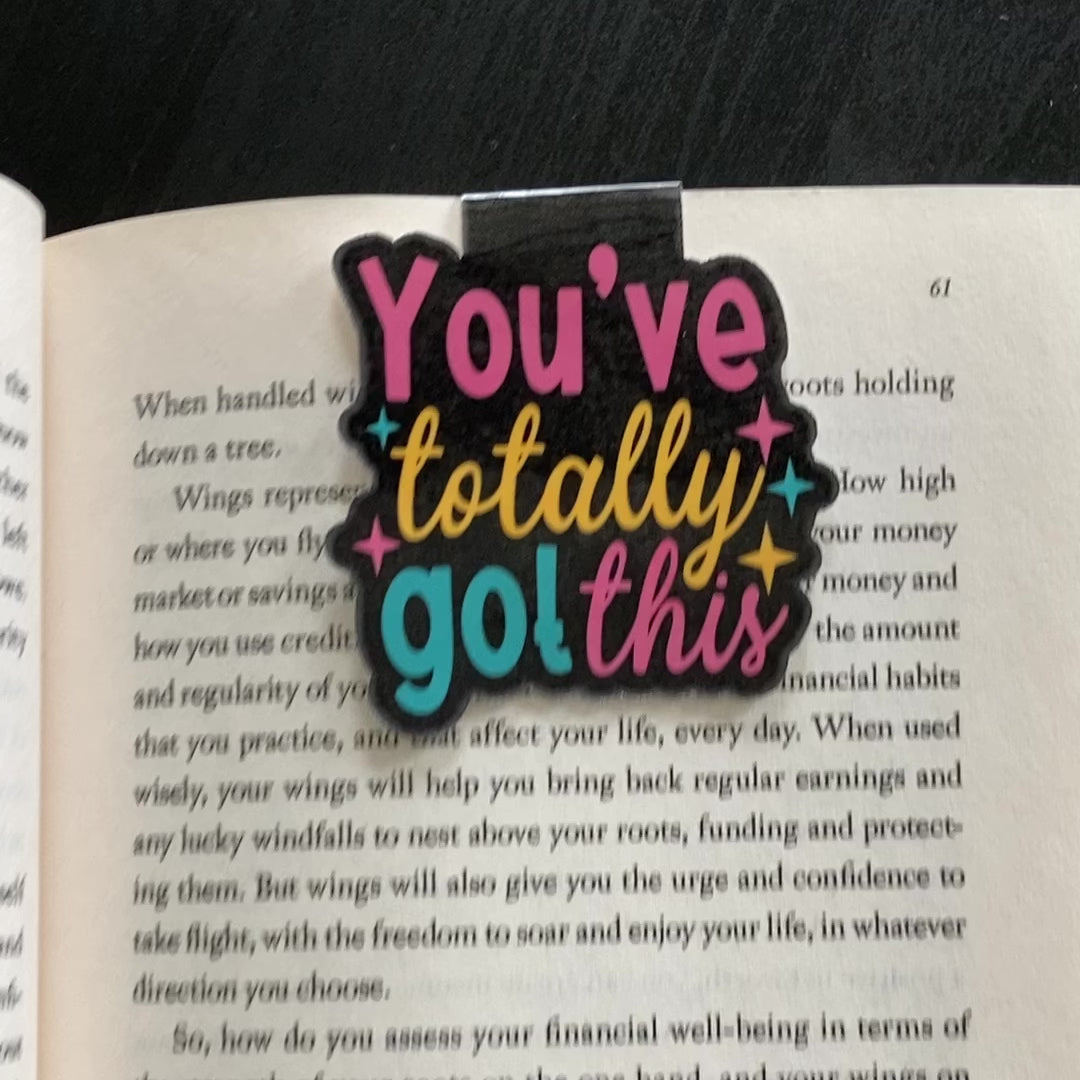 This listing is for one magnetic bookmark that says, "You've Totally Got This." It's perfect for holding your place just about anywhere! Use it in your favorite book, planner, notebook, or wherever your heart desires!